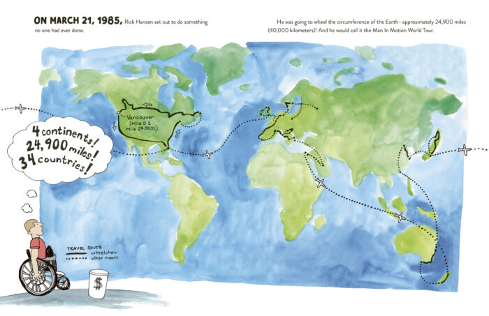 EF: I learned so much! I read all the books that had written about Rick, printed out dozens of photographs from the tour, and spent time on the Rick Hansen Foundation website. I learned that sometimes the hardest moments were followed shortly after by the biggest victories, like leaving Vancouver and having the spare wheelchair break, followed the release of the song “The Man in Motion” for the film St. Elmo’s Fire which helped millions of people learn about the tour.